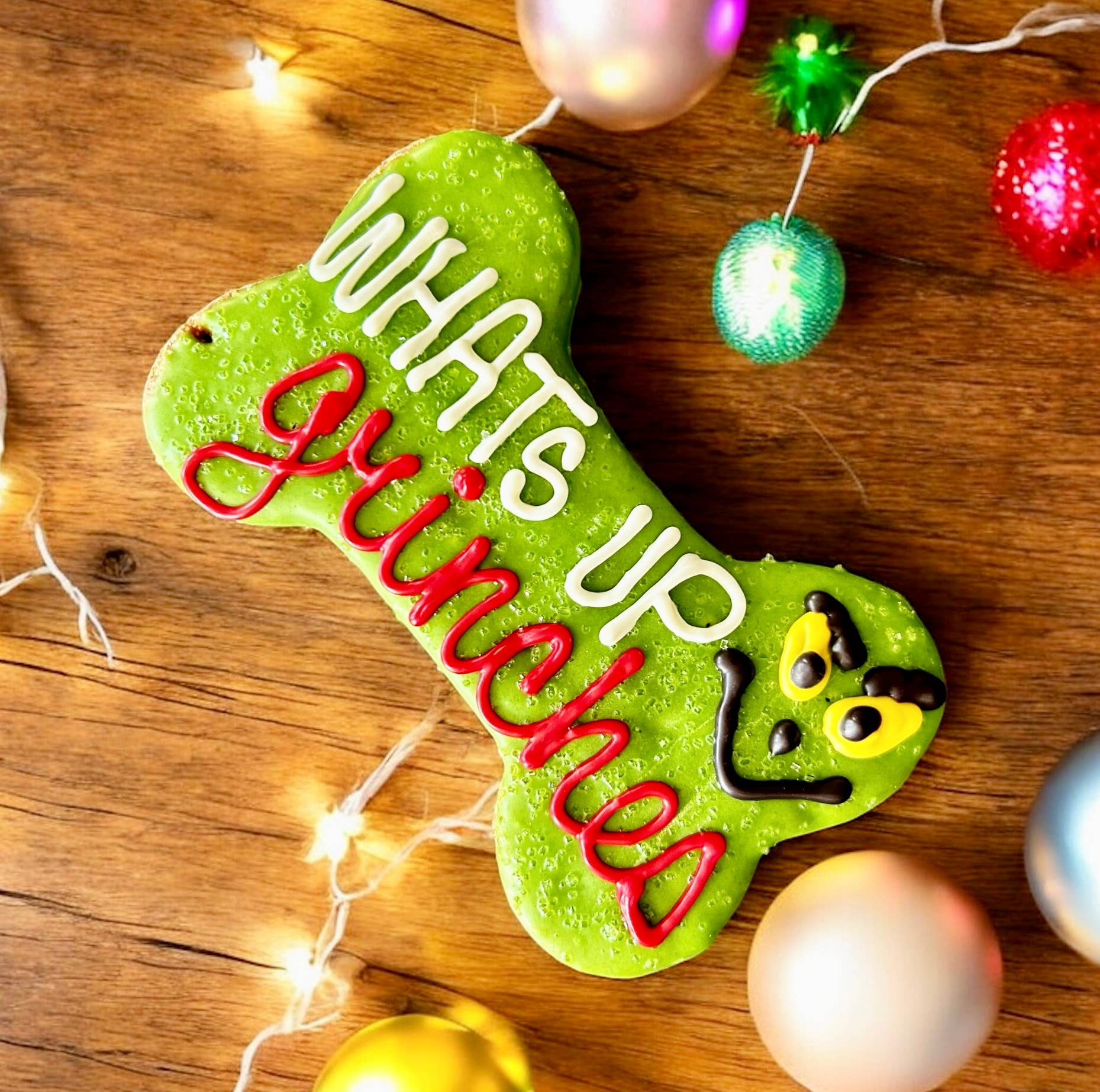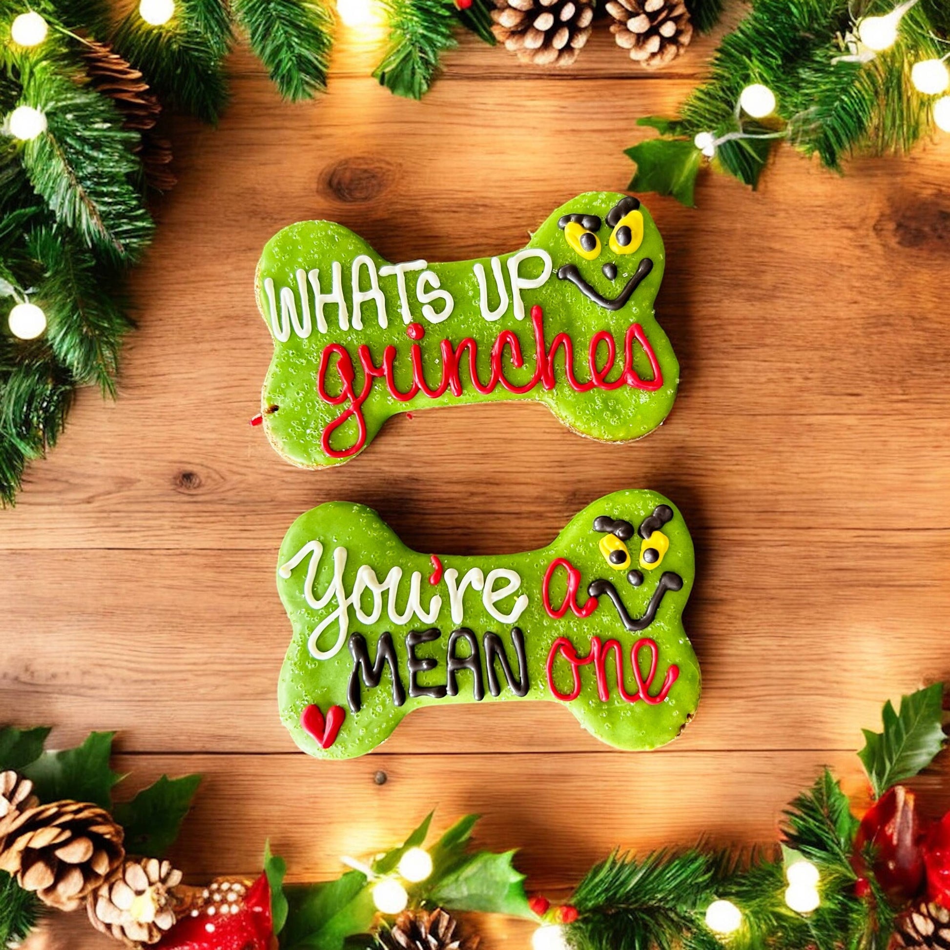 Have a little "pun" with your pup this holiday season with our big green biscuits! There's no way your pup can be a grinch when they get a taste of our drool-worthy peanut butter bones with yogurt frosting. Each bone is hand crafted and decorated so every single one is special. Choose between "What's Up..." and "You’re a mean one"