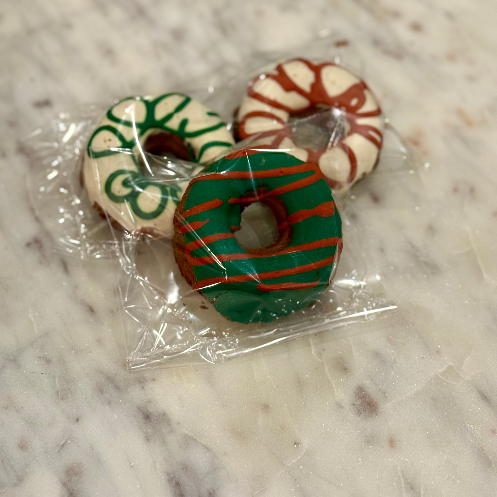 Made from our premium, softer, shelf stable recipe that includes a gentle sweetness from apples the delicious donuts will have your pups tail wagging! Hand decorated with our crave worthy yogurt based icing (thinner than our frosting) in festive colors, they make the perfect gift to give to fur-iends too!