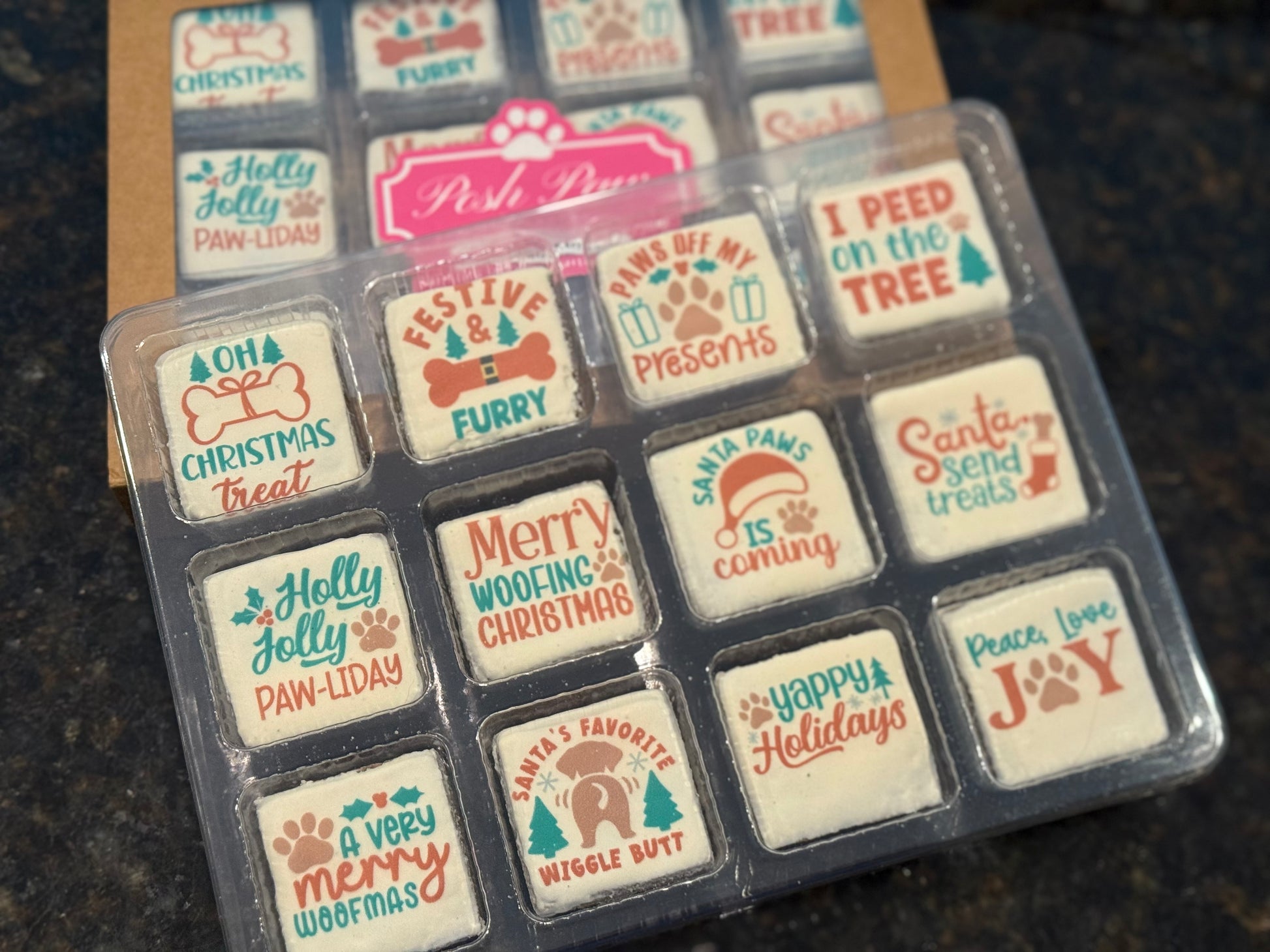 For a pawsitively perfect gift for your furry friend, try our Christmas Advent Snackle Box! Inside, you'll find 24 (see what we did there?) delicious treat squares featuring cute festive designs. Trust us, these treats are "paw"-fectly adorable! Our peanut butter recipe is used to create these treats, with a delectable yogurt frosting that is dehydrated to ensures they stay fresh during transport.