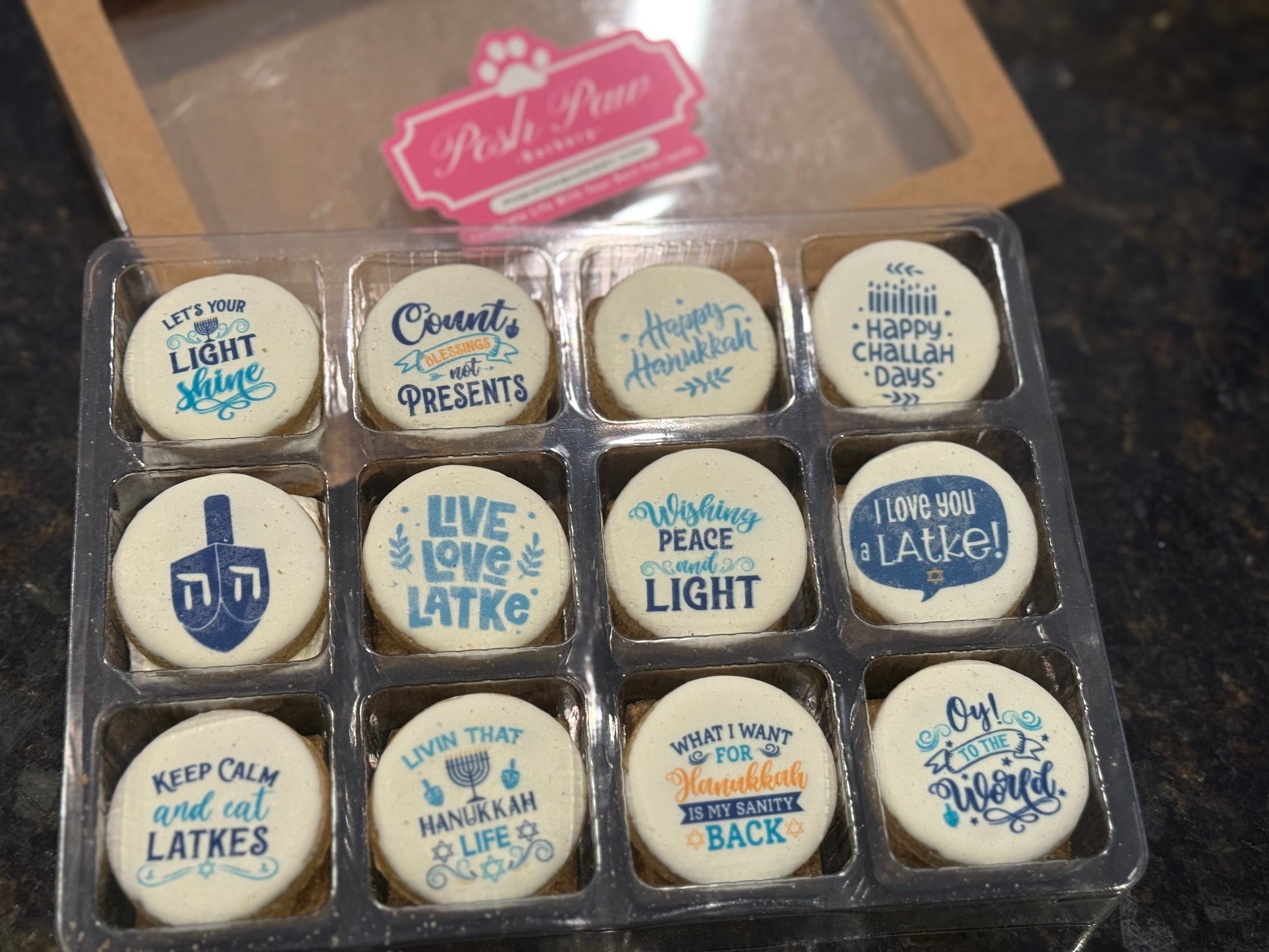 For a pawsitively perfect gift for your furry friend, try our Hanukkah Snackle Box! Inside, you'll find 24 delicious treats featuring 12 festive designs. Trust us, these treats are "paw"-fectly adorable! Our peanut butter recipe is used to create these treats, with a delectable yogurt frosting that is dehydrated to ensures they stay fresh during transport.